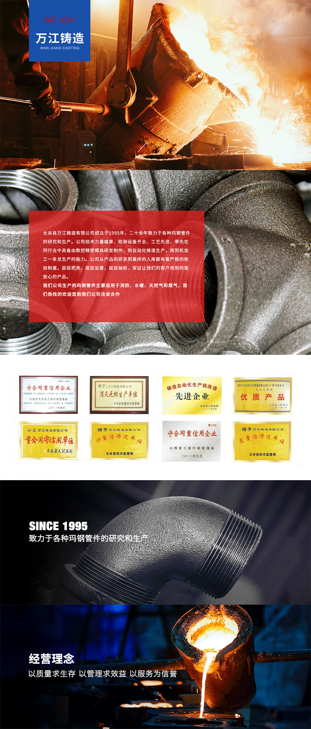 萬江鑄造成立于1995年,二十余年致力于各種瑪鋼管件的研究和生產。